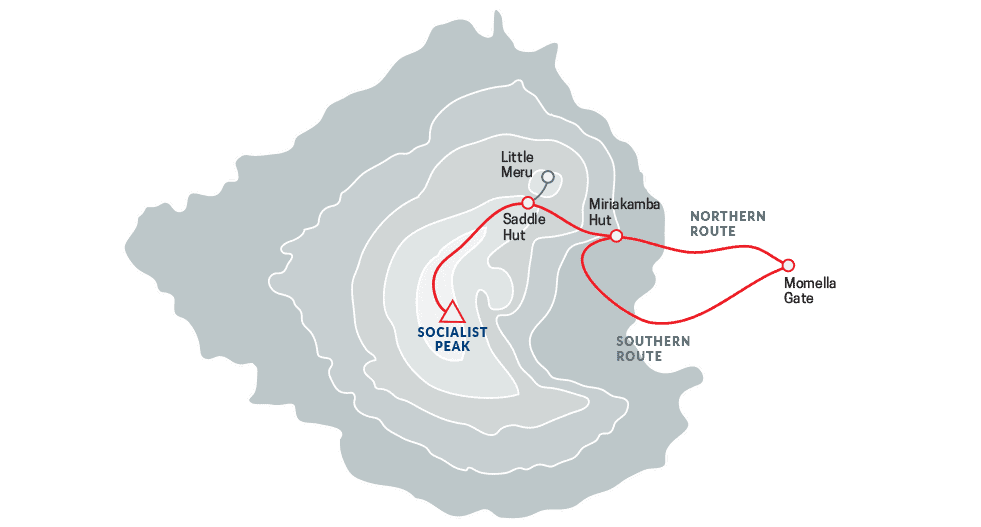 Day 3: Saddle Hut (3,570m) to Socialist Peak (4,566m), then down to Momella Gate (1,500m)